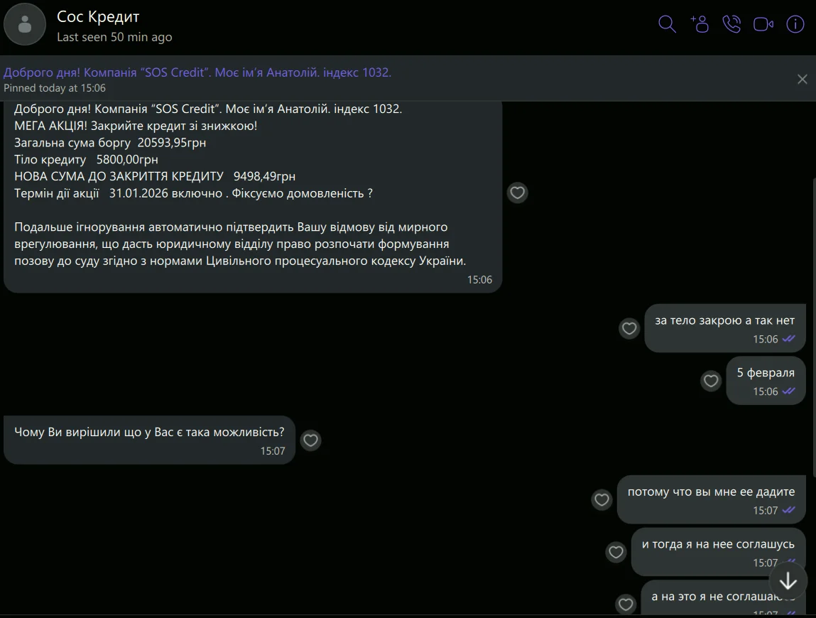 Дорогі друзі , потрібна пвдсказку , маю сос кредит тіло 18000 , прострочка типу перший день , але платіж потрібно було зробити 30 днів назад , сьогодні прислали лист , та ще багато цікавого)))) , хочуть 35000 , як себе поводять? Та що з ними робити? Менеджер наглий , хотів платіж сьогодні 15000 , вже каже заплати 7000, підскажіть що з ними робити?