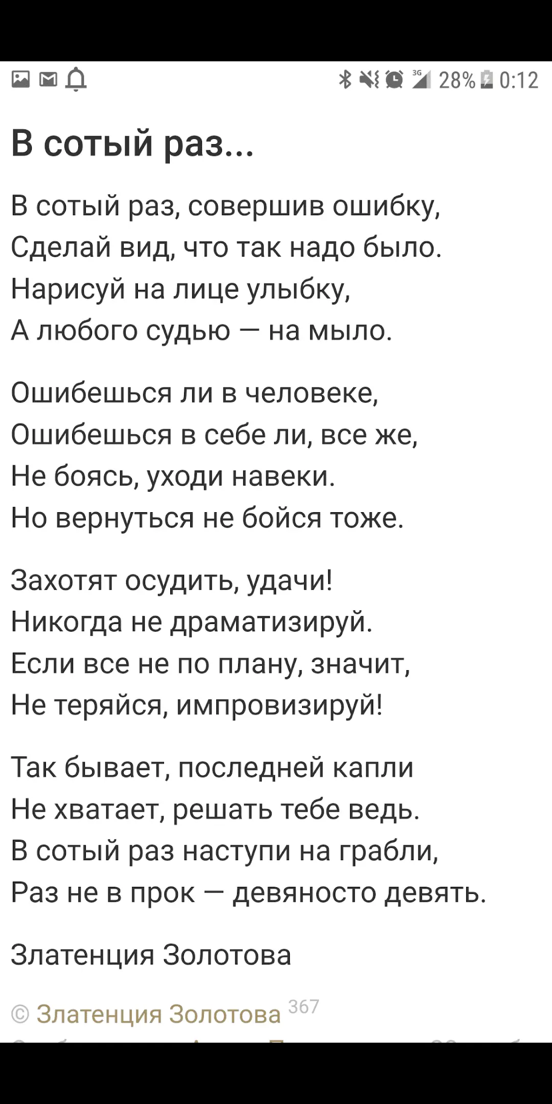 Вы знаете, меня очень поддерживает вот этот стих...с самоиронией, увы, не прокатит.. Эта канитель тянется уже ровно год, на работе уже все, кому не лень, знают. Эту тему за спиной смаковали, смакуют и будут ещё долго смаковать. Но когда делают таки вбросы в соцсети, то здесь уже руководству пофик о моих состояниях, страдает имидж учебного заведения, и конкретно страдает... О своих состояниях скажу одно, как мантру повторяю слова: І все на світі треба пережити...
