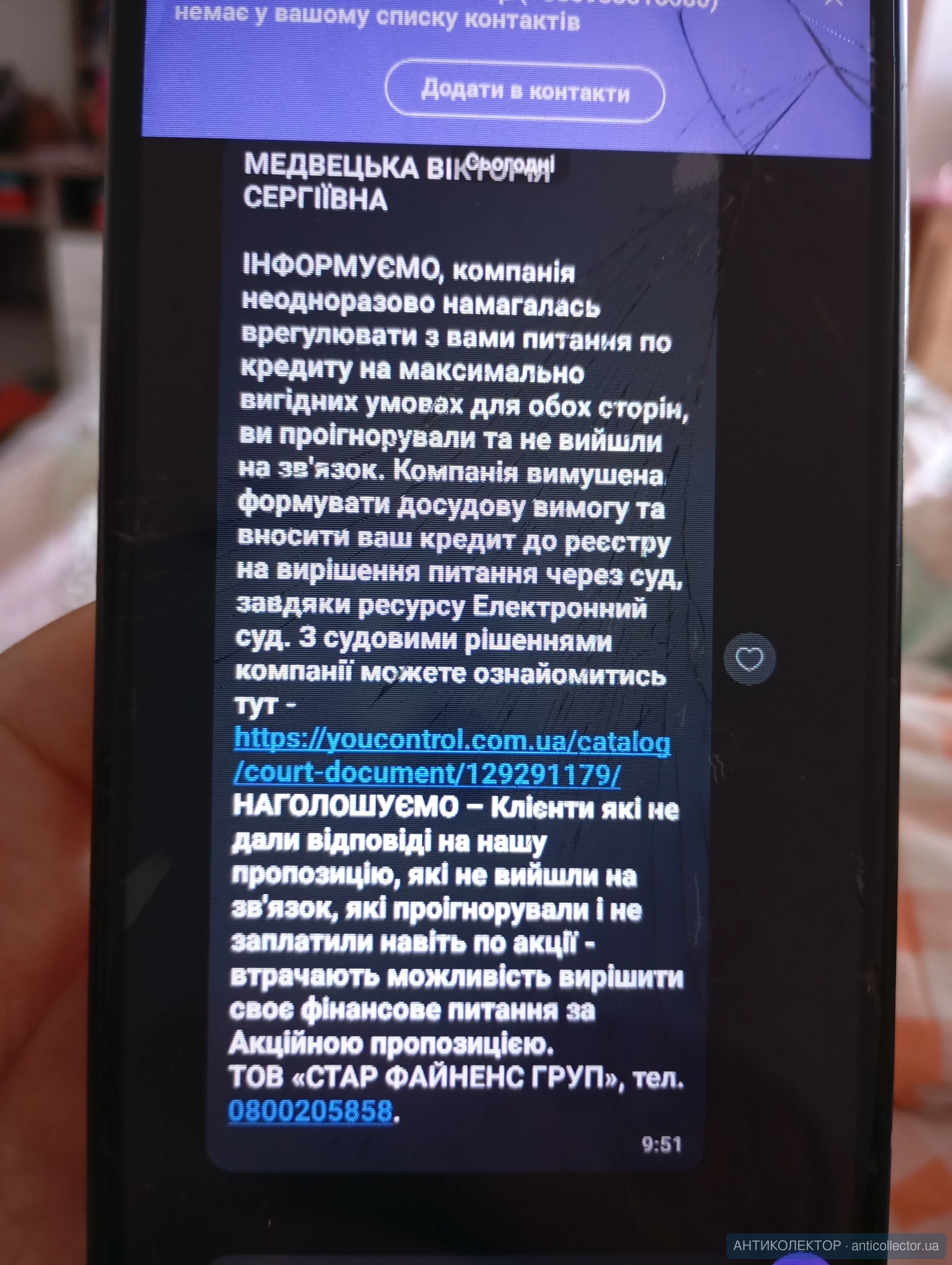 Не переживайте. Старфін сам до суду не подає. От коли продасть калам, ті накрутять ще космічні відсотки і ті тоді можуть подати до суду. Мене і лякали, і просили, я і в НБУ на них скаргу катала, довго пропонували тіло, на той час не змогла закрити, і продали КК.