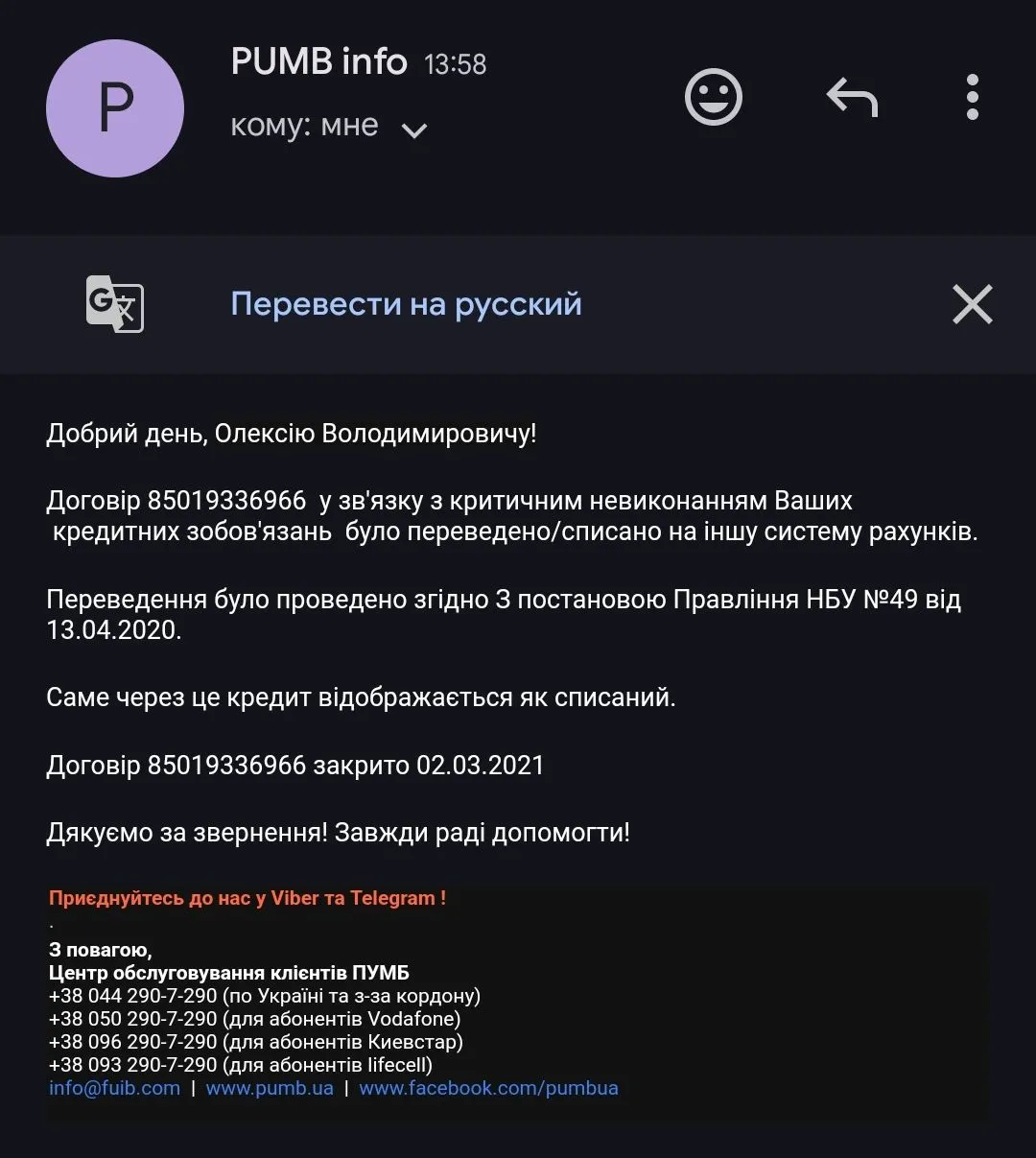 Писав та телефонував в ПУМБ, там кажуть що кредит закритий. Пишу в УБКІ, кажуть що ПУМБ надає інформацію що він списаний, і так по колу.