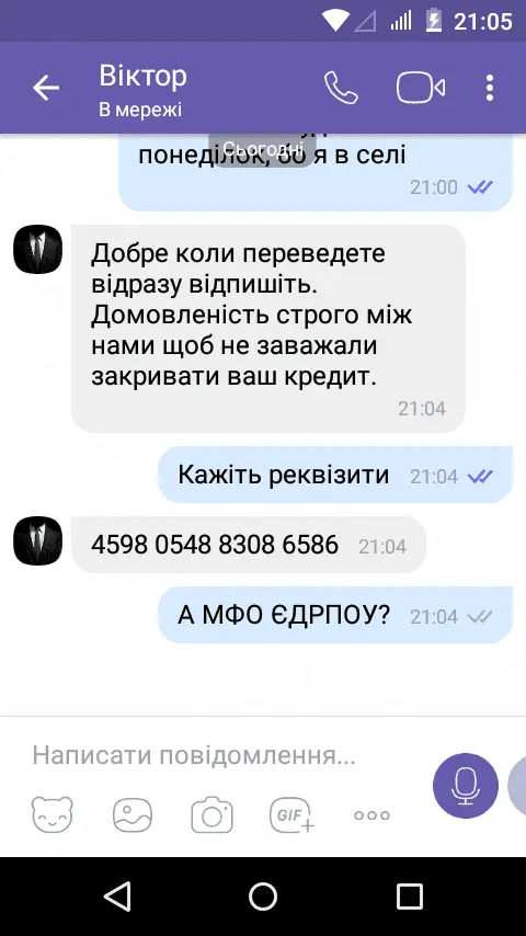 Всім привіт! Мілоан мене продав К-Капітал, причому дуже скоро. Пройшло трохи часу, об'явився КК, пропонують оплатити 500 грн, і за 2500-3000 закрити кредит(тіло 2800,нарахували 10500). Документи надіслали укрпоштою,все норм. Пише сьогодні в вайбер чувачок,що може закрити за 5000, але скидає свою карточку, і каже щоб то було між нами, щоб не заважали кредит закрити. Зараз прикріплю скріни.
