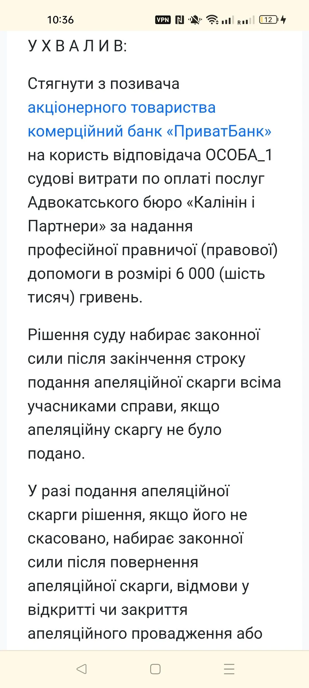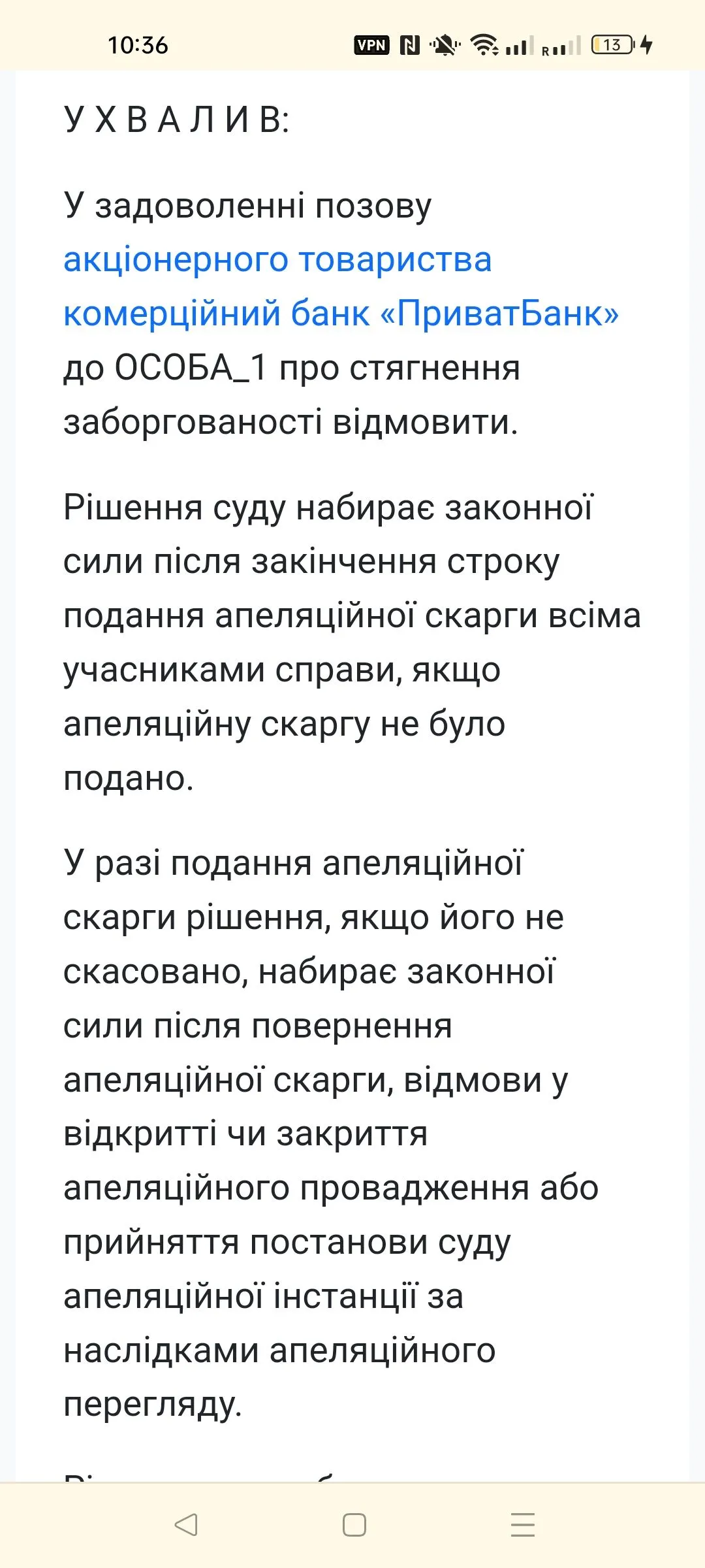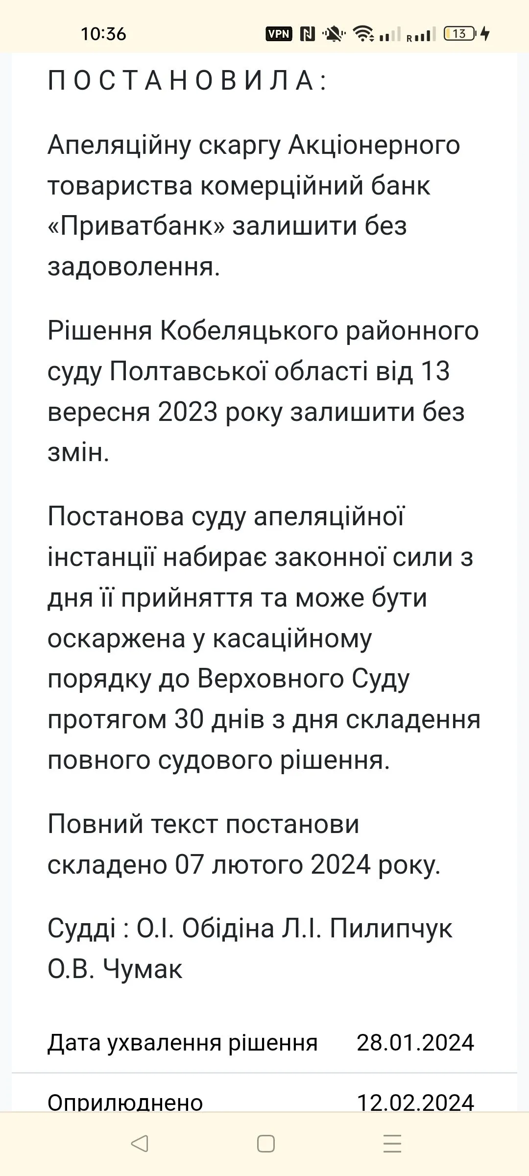 Все наче б то чудово але в листопаді 2023 ПриватБанк подає апеляційну скаргу на скасування рішення яка я мала вже на той день. Після пари засідань я все ж таке отримую рішення в якому всі вимоги ПриватБанку не задоволені.