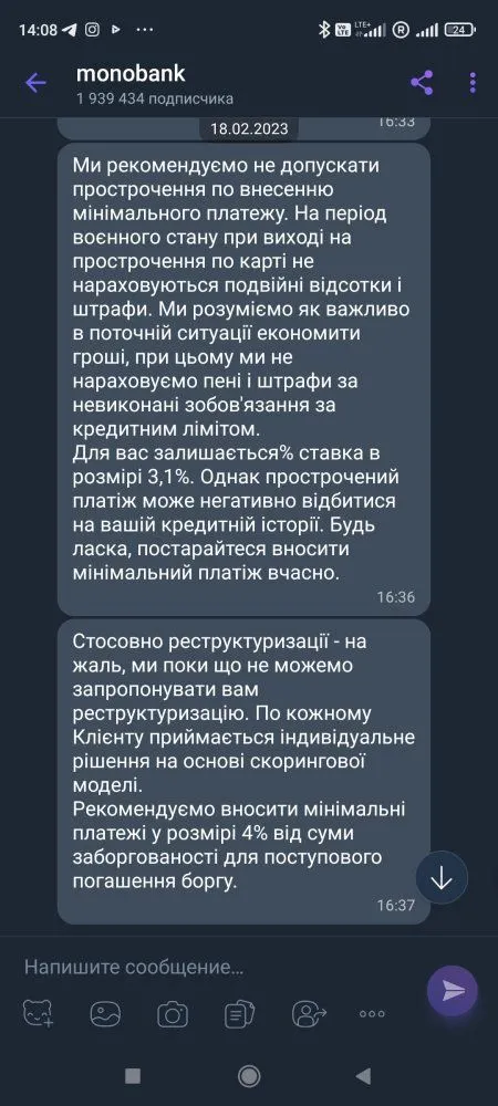 4.До декабря 2022 гашу исправно минималку с процентами, возможности дальше гасить минималку пропадают, связываюсь с службой поддержки, приложу скрин...(обращение по реструктуризации, войти в положение и приостановить начисление процентов, наступление форс мажорных обстоятельств, длительность положительной кредитной истории, им все до одного места...)