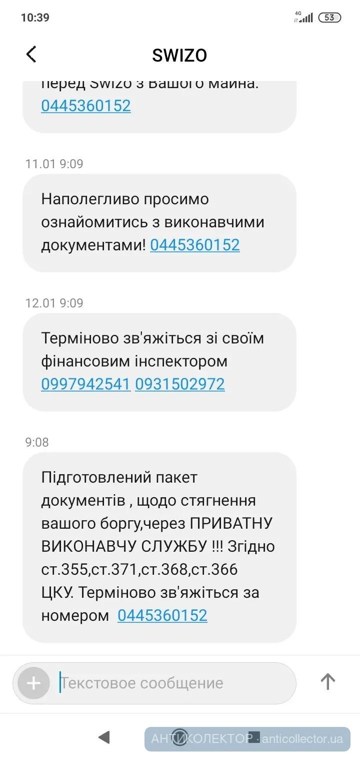 А мне от swizo сегодня письмо пришло. Увидомление о визите. Написали приедут, будут осматривать и оценивать имущество (хотя у меня нету никакого имущества, ну да ладно) будут общаться с соседями, родственниками. И если до 10.01 не оплачу, то в суд подадут. Вот так вот.