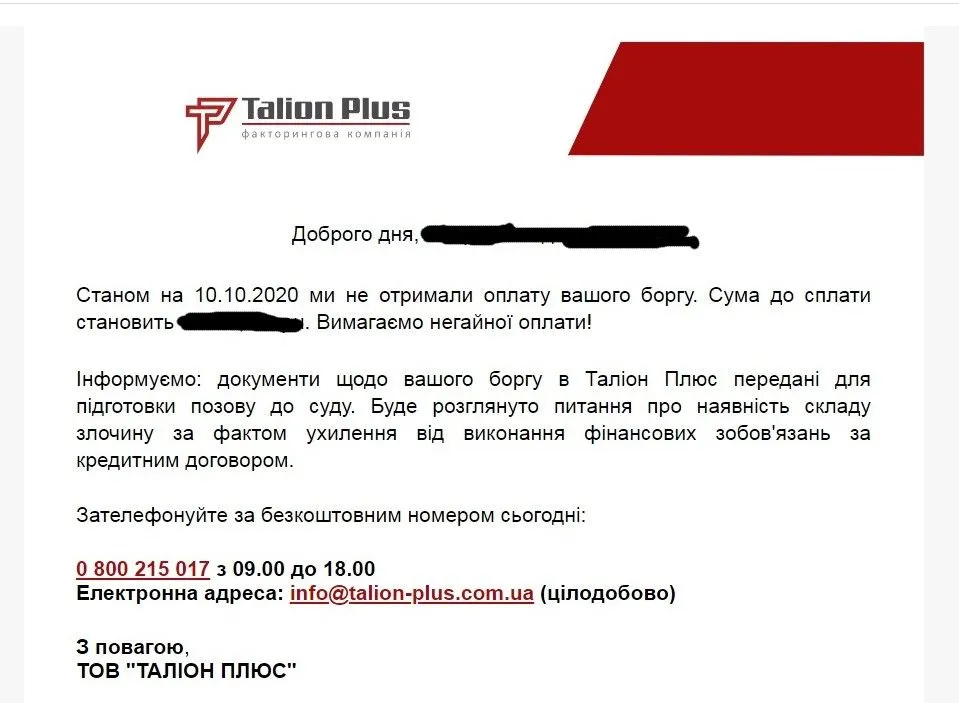 Talion+ уведомил по e-mail о подготовке позову до суду
