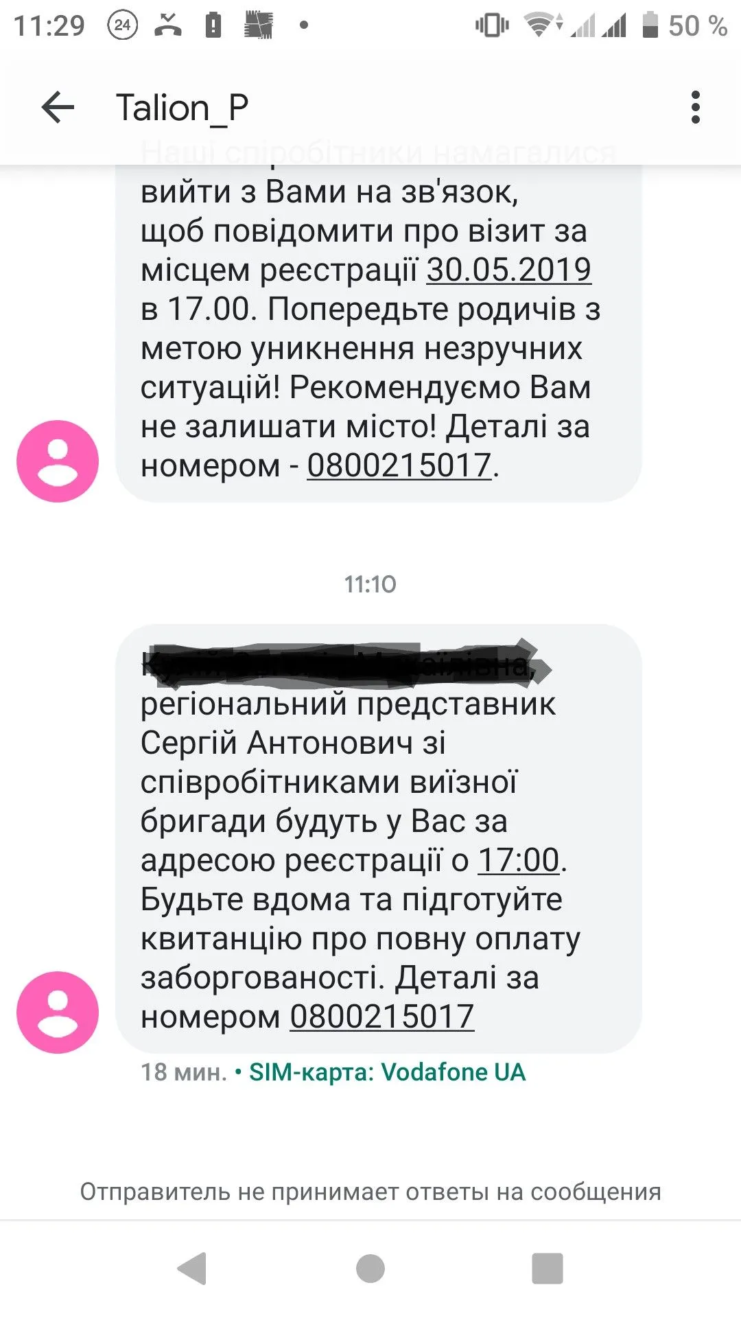 Наші спіробітники намагалися вийти з Вами на зв'язок, щоб повідомити про візит за місцем реєстрації 30.05.2019 в 17.00. Попередьте родичів з метою уникнення незручних ситуацій! Рекомендуємо Вам не залишати місто! Деталі за номером - 0800215017.