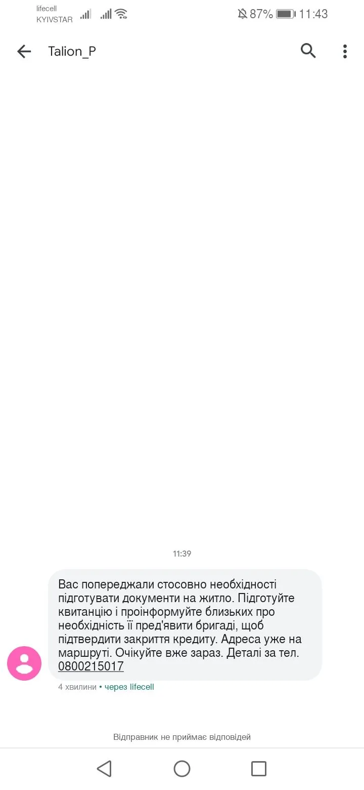 Вас попереджали стосовно необхідності підготувати документи на житло. Підготуйте квитанцію і проінформуйте близьких про необхідність її пред'явити бригаді, щоб підтвердити закриття кредиту. Адреса уже на маршруті. Очікуйте вже зараз. Деталі за тел. 0800215017, и мне такое пришло