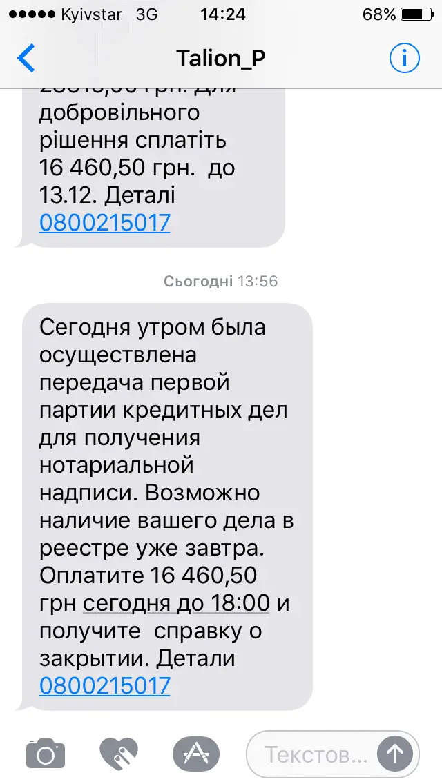 Мне после угрозы заплатить до 13 или наклепают надпись, пришло -Сегодня утром была осуществлена передача первой партии кредитных дел для получения нотариальной надписи. Возможно наличие вашего дела в реестре уже завтра. Оплатите 10 561,95 грн сегодня до 18:00 и получите справку о закрытии. Детали 0800215017