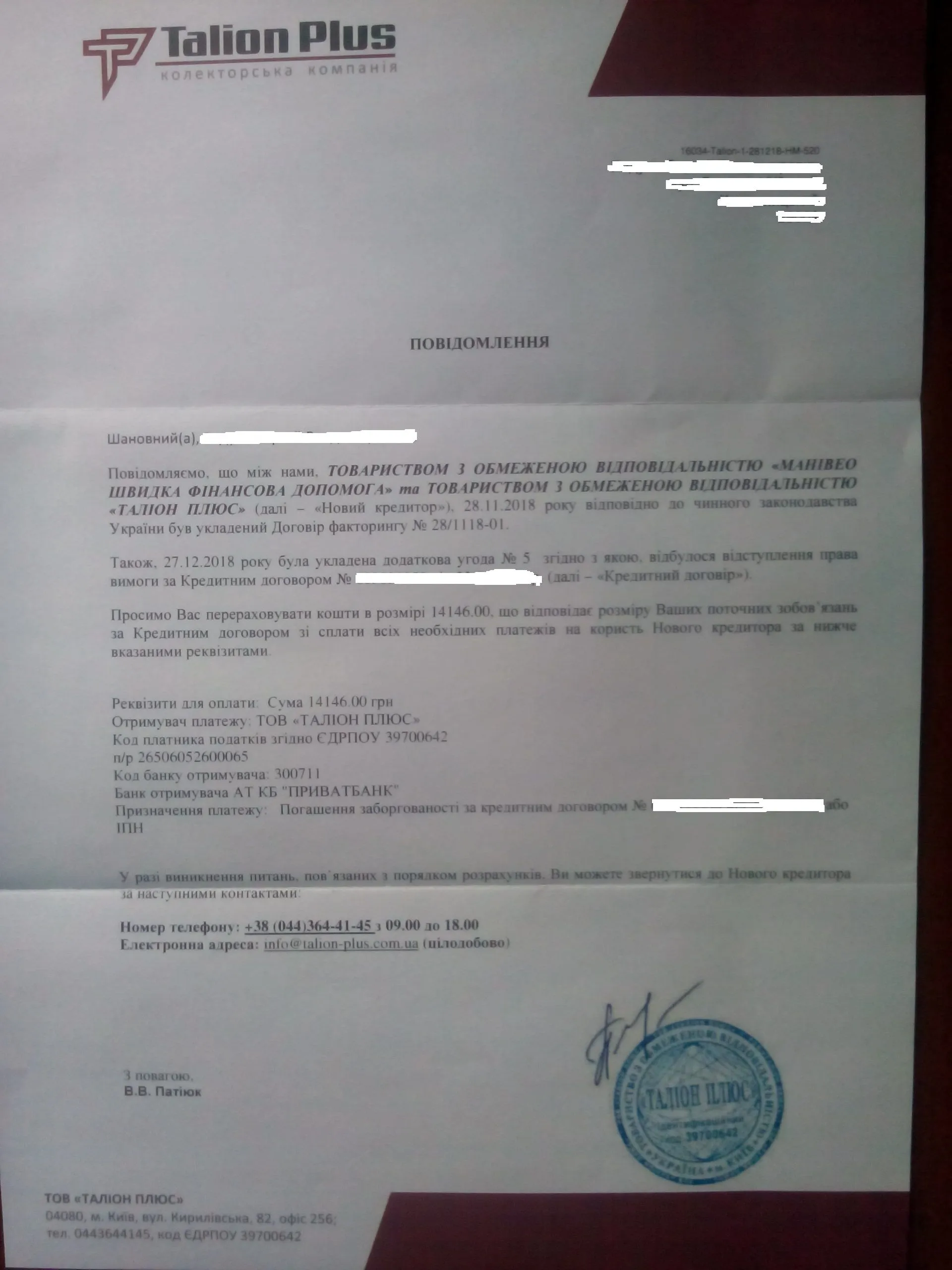 Кредит був виданий на суму хххх грн, проте наразі штрафні відсотки по кредиту складають ххх% від тіла кредиту. (Загальна сума кредитних забовязань з відсотками хххх грн). Прохання до вас, як до регулятора, здійснити перевірку на відповідність до законодавства України договір від XX.XX.20XX № XXXXXXXXX (строк дії договору XX днів) укладений між товариством МАНІВЕО ШВИДКА ФІНАНСОВА ДОПОМОГА та ВАШЕ ПРІЗВИЩЕ ІМЯ ПОБАТЬКОВІ.