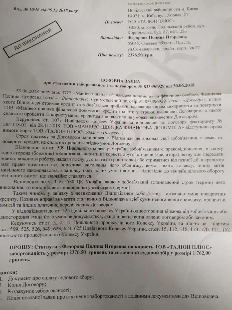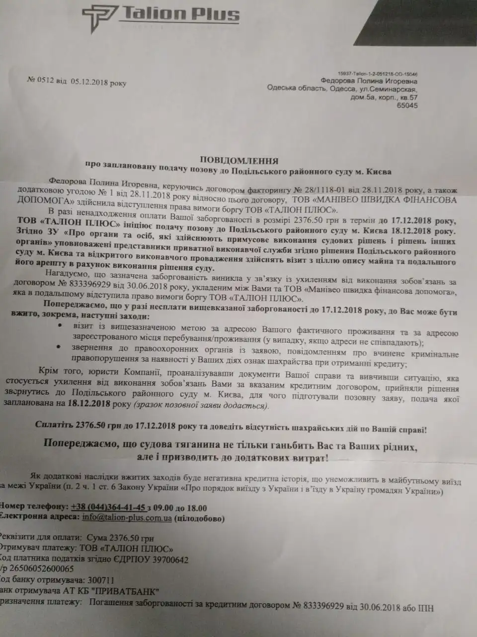 «Таліон Плюс» колекторська агенція перейдіть за даним посиланням та ознайомтесь з правовими аспектами роботи по Вашій Кредитній справі. Ваш борг не сплачено! Ми ініціюємо початок примусового стягнення через суд. тел. 0443644145. Кому-то ещё приходило?