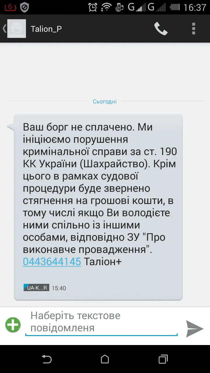 "Ваш борг не сплачено. Ми ініціюємо порушення кримінальної справи за ст. 190 КК України (Шахрайство). Крім цього в рамках судової процедури буде звернено стягнення на грошові кошти, в тому числі якщо Ви володієте ними спільно із іншими особами, відповідно ЗУ "Про виконавче провадження". 0443644145 Таліон+"