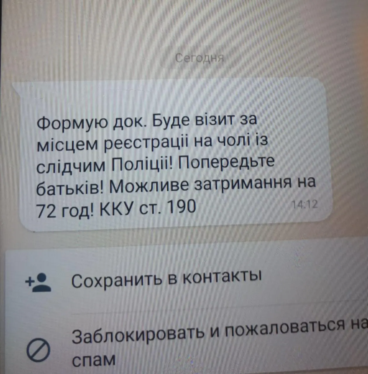Судя по отзывам на форуме о таких см с, это все пугалкиФормую док. Буде візит за місцем реєстраціі на чолі із слідчим Поліціі! Попередьте батьків! Можливе затримання на 72 год! ККУ ст. 190 Кто такое получал в смс???Чего ждать от этих твapeй???