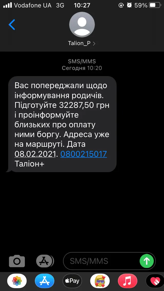 Кто сталкивался с такой ситуацией, подскажите как действовать и как наказать их? Брала в манивео 5000грн, отдала пролонгациями 6000 грн, теперь вышла на просрок и Манивео, якобы продали долг в талион+ и теперь эти товарищи отправляют сообщения с угрозами людям которых я не знаю даже и которые не относятся ко мне никак. отправляют сообщения моей свекрови и ее соседям вообще в другом конце города, Хотят чтоб я им еще выплатила 13000 грн, просрочка 45 дней. Что делать, как остановить распространение информации по всему городу?