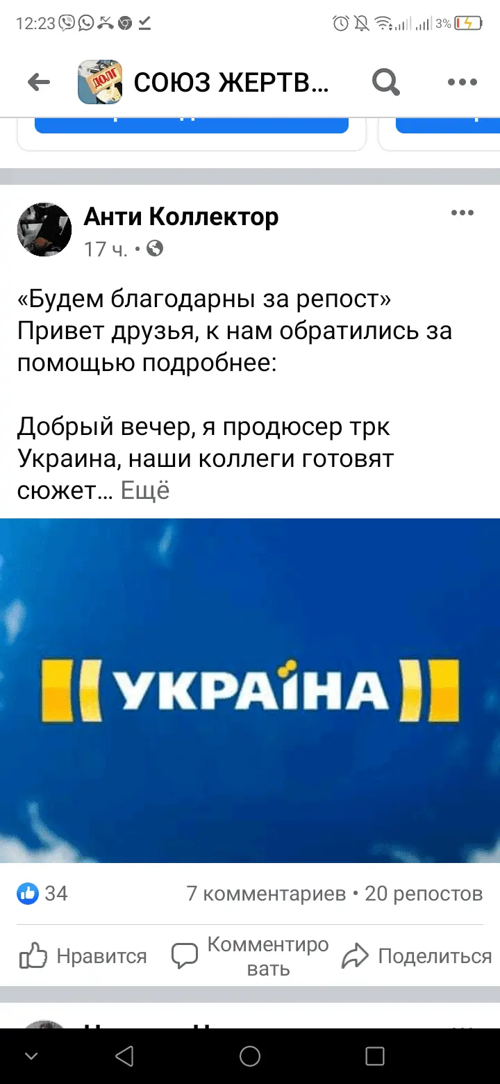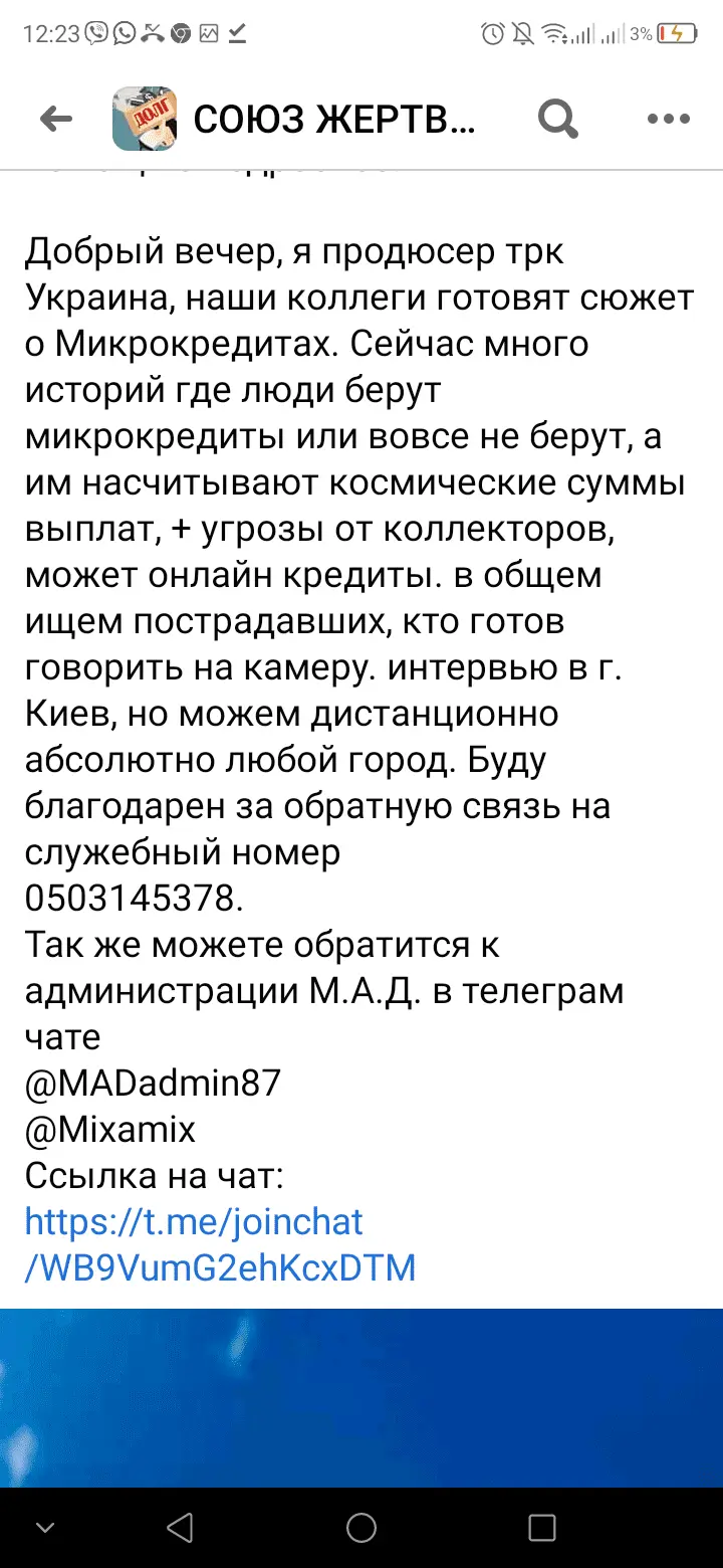 Интересный способ, вытащить "зубастых" заёмщиков из "подполья"....Добрый вечер, я продюсер трк Украина, наши коллеги готовят сюжет о Микрокредитах. Сейчас много историй где люди берут микрокредиты или вовсе не берут, а им насчитывают космические суммы выплат, + угрозы от коллекторов, может онлайн кредиты. в общем ищем пострадавших, кто готов говорить на камеру. интервью в г. Киев, но можем дистанционно абсолютно любой город. Буду благодарен за обратную связь на служебный номер