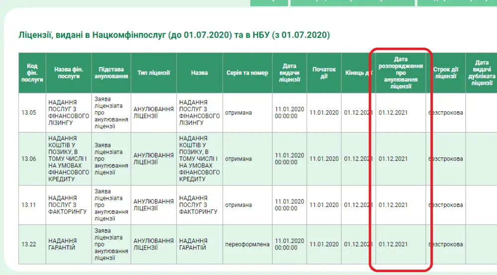 1 декабря 2021 года НБУ выдал распоряжение об аннулировании лицензий на предоставление финансовых услуг ТОВ ФК Алурия.
