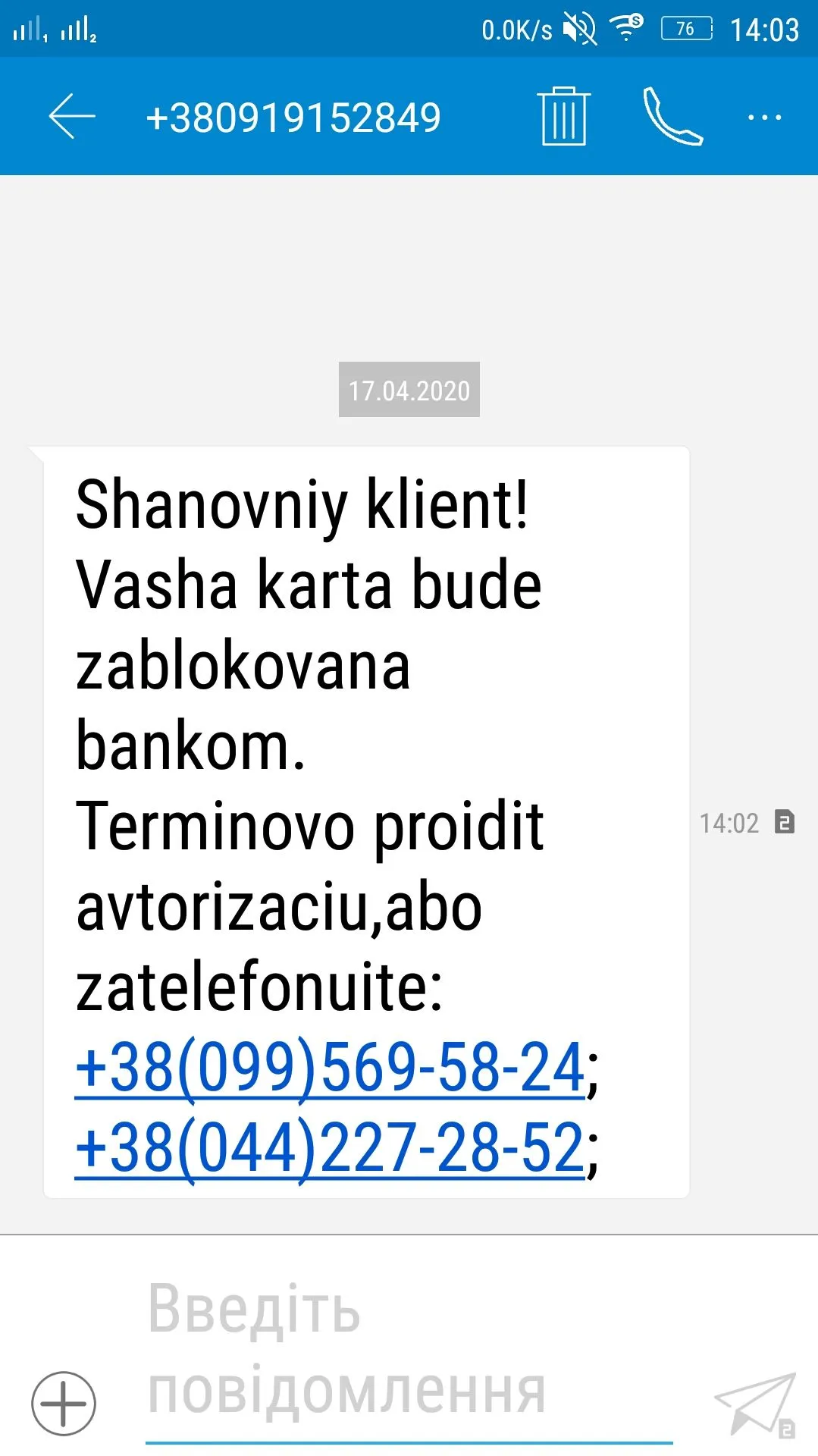 У каждого банка есть альфа-имя для отправки инфо сообщений, с левых номеров ни один с них не шлёт смс.Коллєги! Кому таке приходило? Що за фігня?