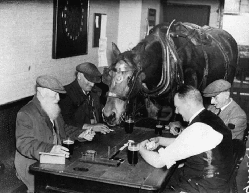 Переглянути вкладення 145642Джек Фаулер, вугільний торговець з Бедфорда і його кінь на прізвисько Сем протягом кількох років ходили в бар, випити пива і пограти в доміно, 1930-і