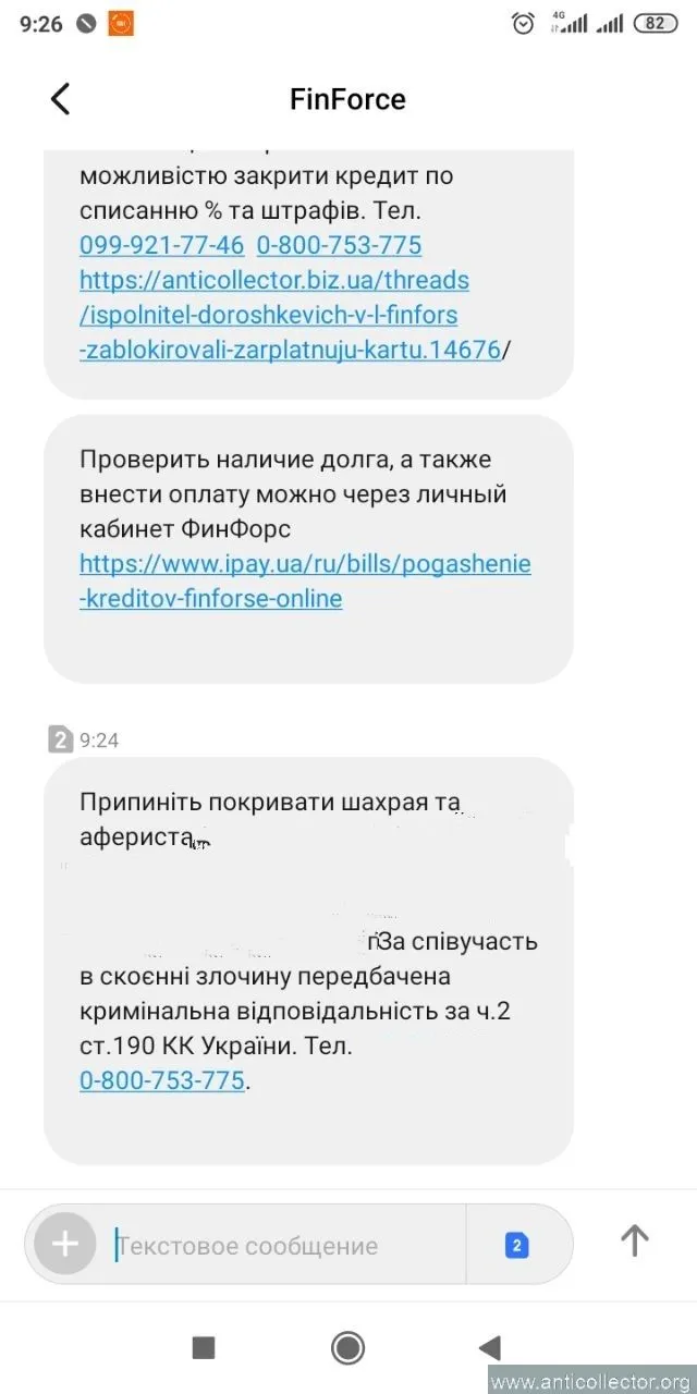 Коллаж или такое же смс? Наверное вы их очень обидели))))Финфорсик мне и родным тоже присылали. Потом в вайбер написали что я тв@рь и все. От меня полный игнор. Просрочка год.