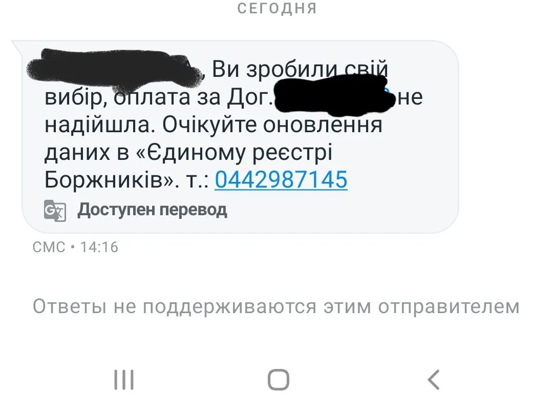 ************, Ви зробили свій вибір, оплата за Дог.№***********не надійшла. Очікуйте оновлення даних в «Єдиному реєстрі Боржників». т.: 0442987145