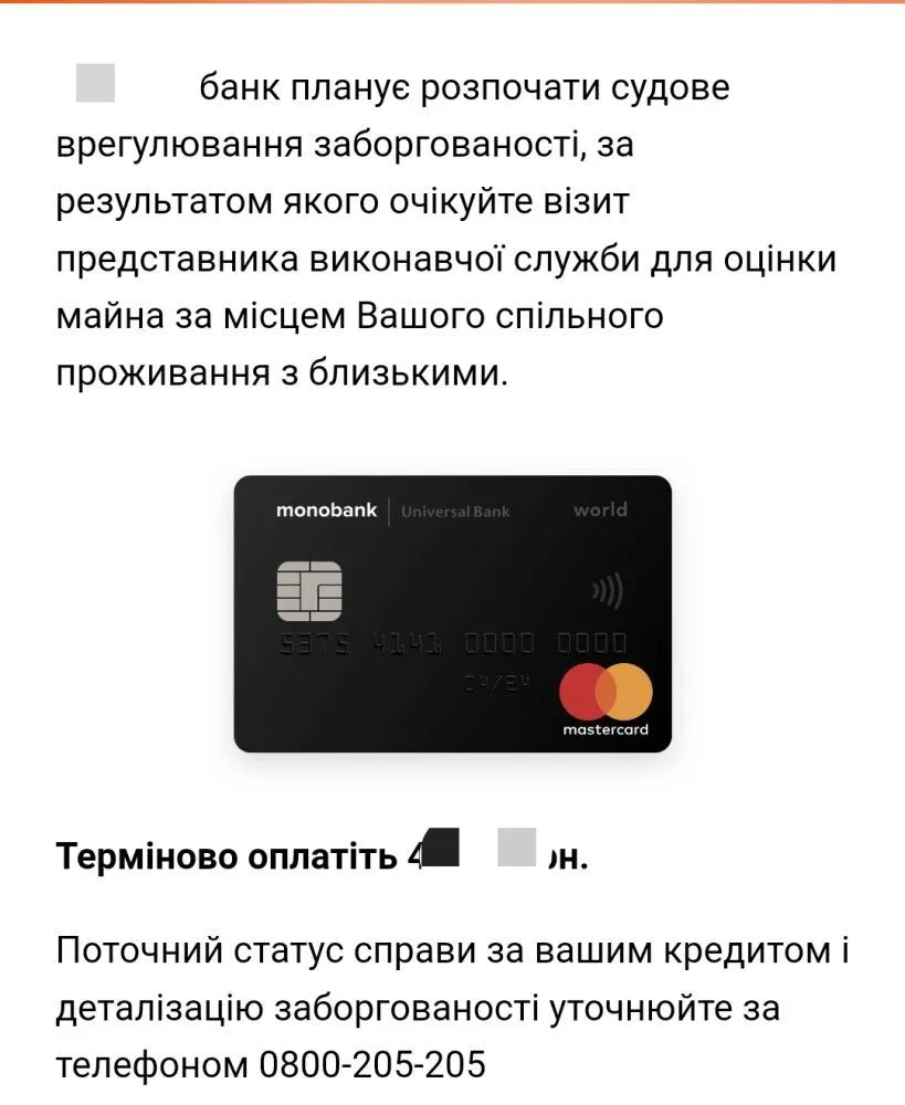 Монобанк прислал такое чудесное уведомление, в силу проблем с деньгами и работой в последние полгода перестал платить ежемесячный платеж, сумма долга 48к (кредитка с лимитом), собственного имущества нет, прописка у родителей, но работа официально, чего ждать? Заранее благодарю
