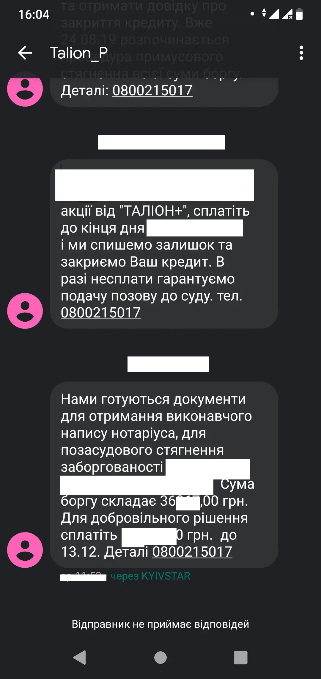 Клієнт! Сьогодні Ваші документи, за Кредитом «MONETKA», були передані нотаріусу. В понеділок, 28.10.2019р., ми отримаємо виконавчий напис та відразу передаємо справу на приватну виконавчу службу, для відкриття виконавчого провадження. Останній термін для добровільної сплати 14020 грн., сьогодні, до 17-ї години. Тел.: 0800210005 або monetka.ua.