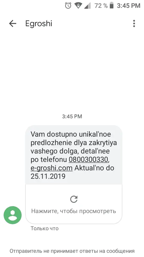 Мне уже штук пять пришлиЕщё вчера обзвонили всех, оболгали.. угрожали.. и ТД. Вчера на 1545 та звонила, оставила жалобу на 1545 , на НБУ написала. А Сейчас смс пришла