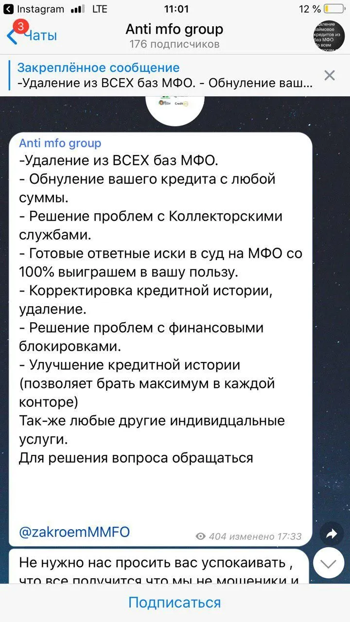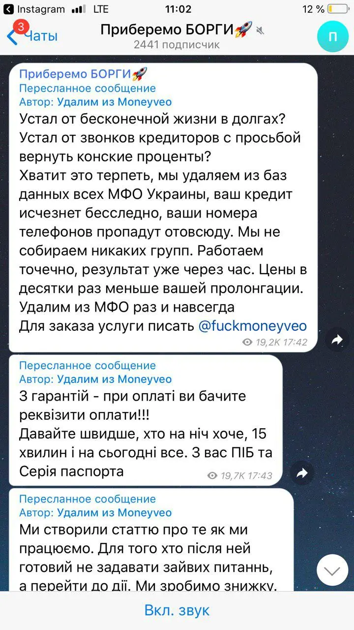 Доброго времени суток ,Достопочтенные форумчане !У меня вызвала недоумение одна реклама на просторах интернета. Якобы ссылки на канал телеграмма со словами "удаляем из базы МФО". Таких каналов несколько и берут за свои услуги 700 грн ,но при этом просят паспортные данные и ФИО. Что вы думаете на счет этого? Дурят на ровном месте или вполне возможно? Скрины прилагаются
