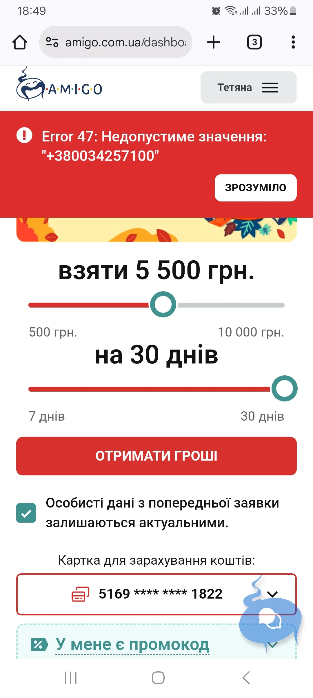 Ломка чи шо?Вирішила подати заявку, подивитися чи відмовлять чи ні. А тут еррор. В підтримці сказали, що я залогінилися з невірним номером. Мені треба вийти і знову зайти.