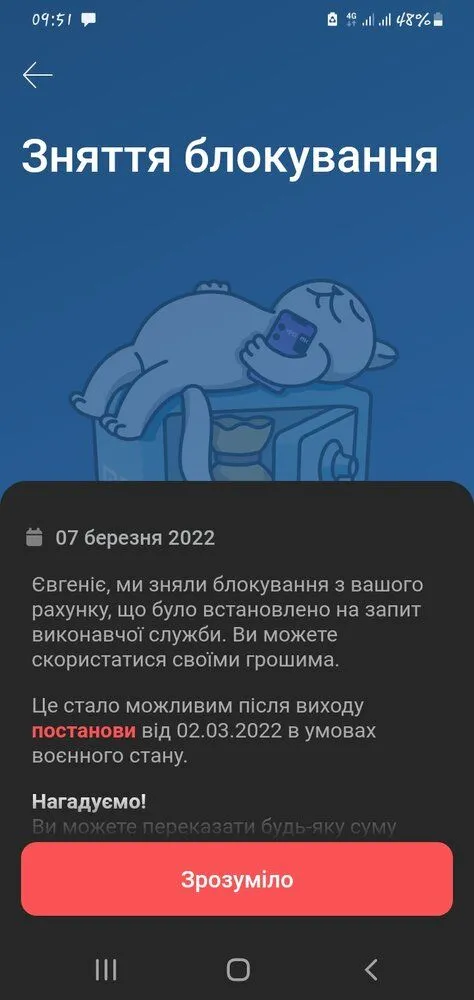 А у меня раблочили карту Таскомбанка и деньги, которые были заморожены в связи с ИП - пропали. Походу списались в пользу исполнителя ... Хотя суд остановил ИП, постле обеспечения иска! Я ВШОКЕ! Тупо беспредел. И Обидно, что вернуть походу можно будет не скоро ... суд еще не прошел, да еще и война ... Говорили в банке, когда ЗП переводил на их карту, что деньги никуда не денутся ... А тут взяли и делись ...