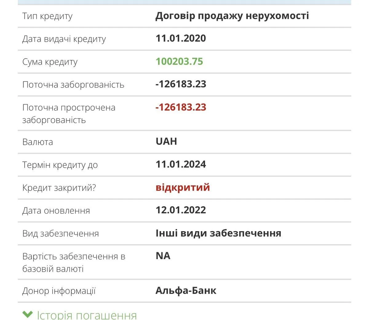 Всем привет! В Убки появилась инфа с Альфа банка. Непонятно что означает тип кредиту, хотя был беззалоговый кредит и недвижимости нет. И что такое "інші види забезпечення"? Как на это реагировать и какой следующий шаг банка? Платила до июня 2020 года