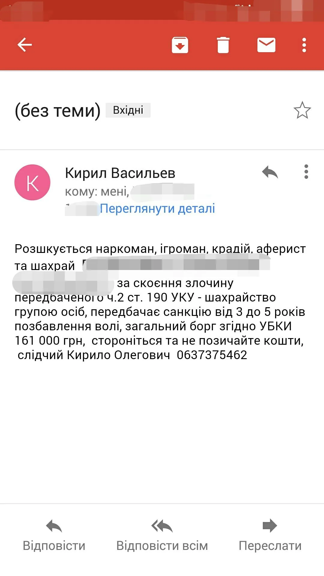 Точно такая тема обсуждается в другом разделе от того же следователя Кирилла Васильева, с таким же содержании письма.