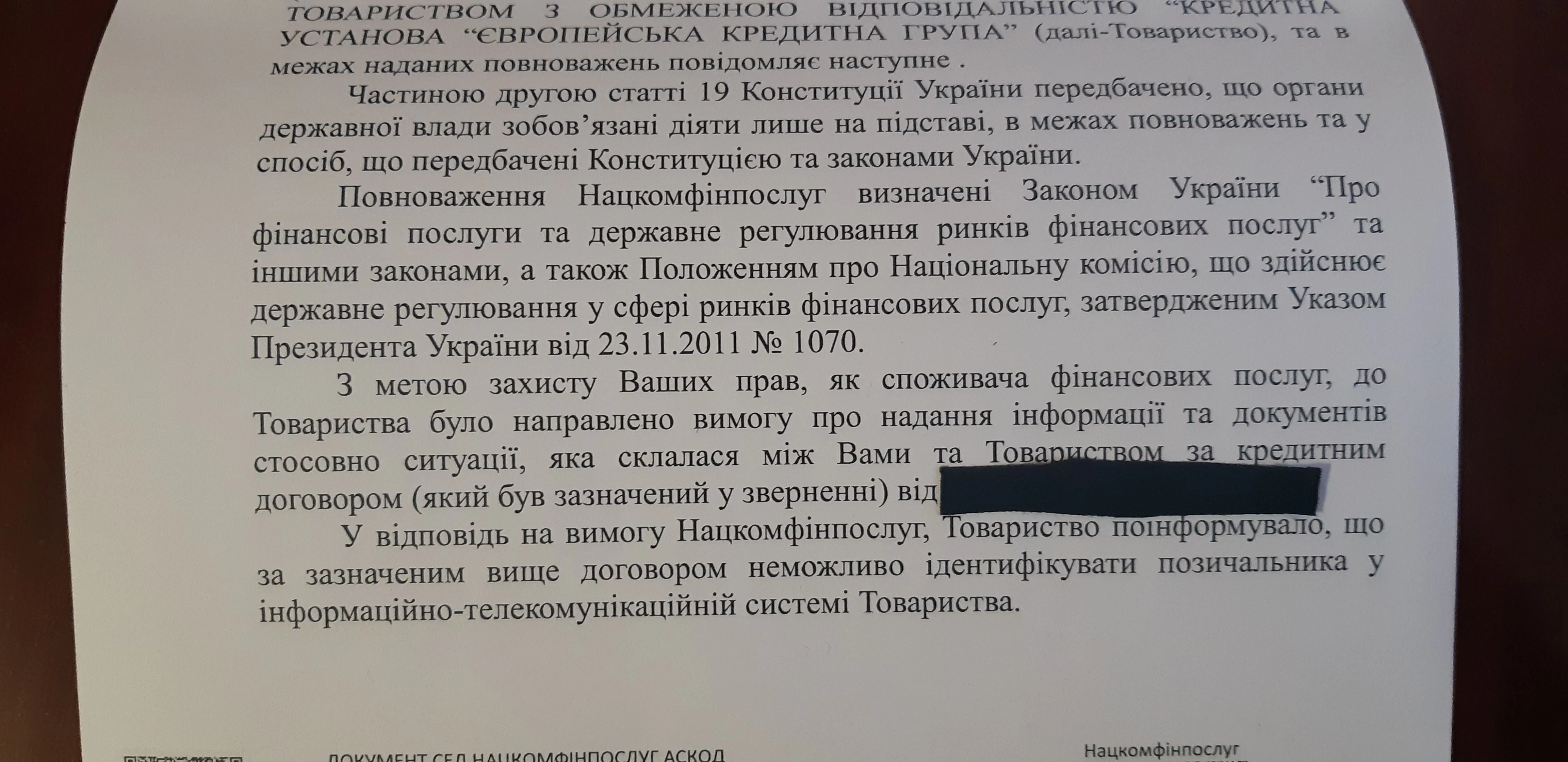 У відповідь на вимогу Нацкомфінпослуг,товариство поінформувало,що за зазначеним вище договором неможливо індентифікувати позичальника у інформаційно-телекомунікаційній системі товариства. Як це розуміти? Євро гроші.