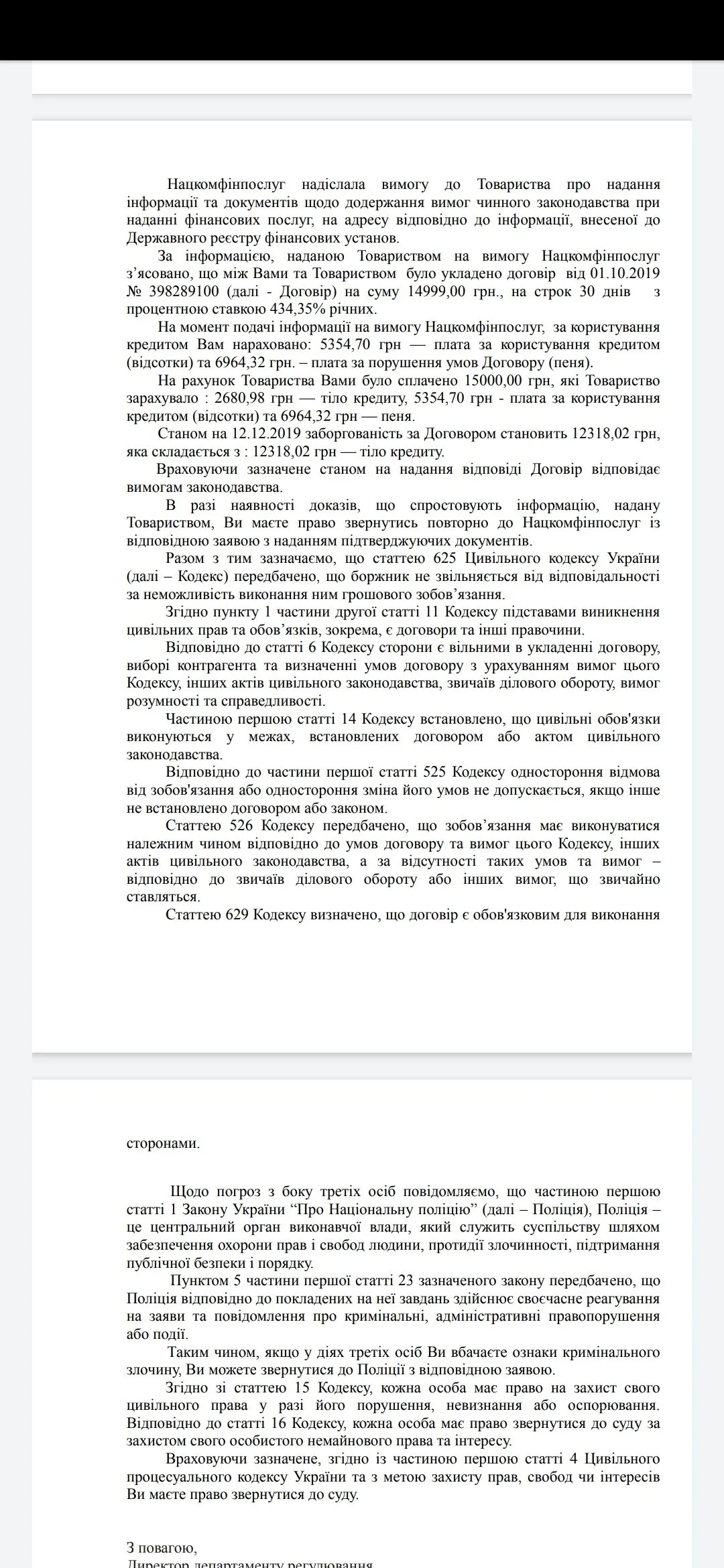 А так же пришёл ответ от нац ком фин на смартивей. Но я оплатила тело. А они насчитывает дальше. Прочитавши письмо я поняла что я в итоге должна