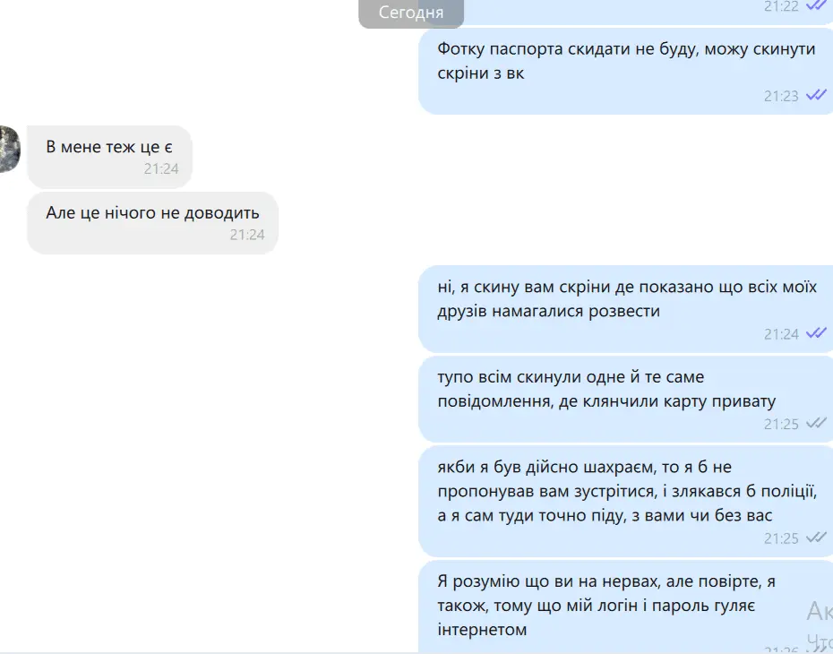 Итак дорогие друзья, вчера создавал тему про взлом в вк, сегодня я возобновил доступ к своей странице, и помимо того, что хотели развести на карту на данные карты моих друзей, так вот какие прояснились интересные детали, советую смотреть скриншоты до конца, чем дальше, тем больше участница данной переписки показывает свою тупость. Судя с ситуации, у меня к вам вопрос форумчане, как поступить с аферюгой 1: идти в полицию, 2: самому постучать по лобешнику, данные то та дeбuлка свои спалила) П.С данные карт номера вроде бы как нарисовал, если где-то остались, Админ не бей сильно пожалуйста)