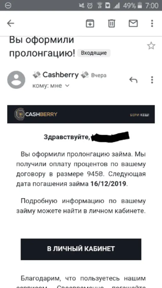 Вчера вечером 16.11 приходит мне на мой эл. адресс письмо о том,что якобы "я" оформила пролонгацию на сумму 945 грн в компании CashBerry! НО дело в том,что я не оформляла займ в этой компании!я когда-то хотела оформить,но получила отказ и это было черт знает когда,полгода назад примерно..