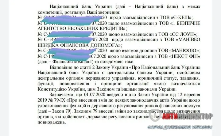 Я отправила 6 обращений по разным МФО, эти Майкредит, Сслоан, Моневео, МонейФор ю и Е- кеш и Свизо. Планировала и по другим писать, но решила получить ответ на первые обращения. Писала я сама, пример у меня был, еще я добавляла сама некоторые статьи, я с документами на Ты, так что мое письмо было составлено верно, юридически аргументированно. Для чего я это делала, писала в НБУ? Я уверенна в том, что некоторые пункты договоров имеют нарушения, нарушают мои права как гражданина моей страны. Чего просила? Я хотела, чтобы применили двустороннюю реституцию к каждому договору и каждому МФО. Ответ вы прочитаете ниже. Вывод мой: НБУ дает стандартные отписки и я планирую писать новый запрос о том, что ответ на мои запросы в этом письме отсутствует, ведь я высылала эти договора и просила регулятора проверить на соответствие с законодательством- они этого не сделали. Более того, я им звонила, и мне НБУ рекомендует им написать претензию. В общем, то ли еще будет?, будем бороться?