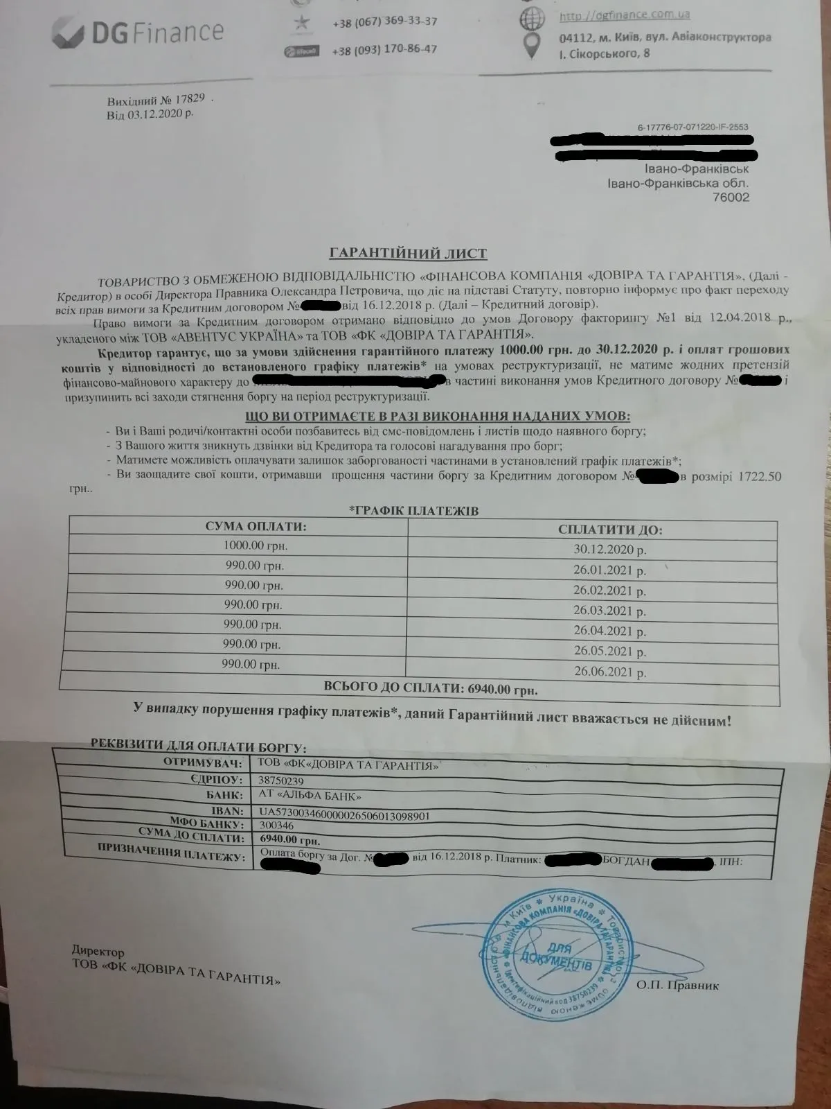 Я домовився, мені прислали гарантійного листа з реструктуризацією боргу на 6 місяців, перший внесок 1000 і 6 міс по 990 грн до 25 числа кожного місяця. Так плачу і все норм, подивимся що далі буде