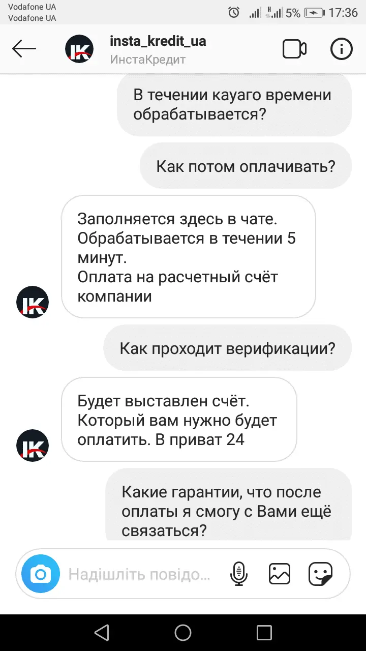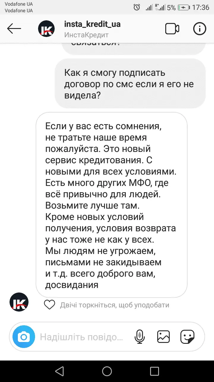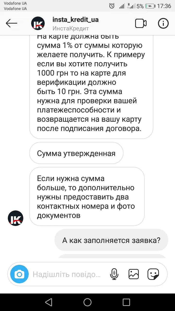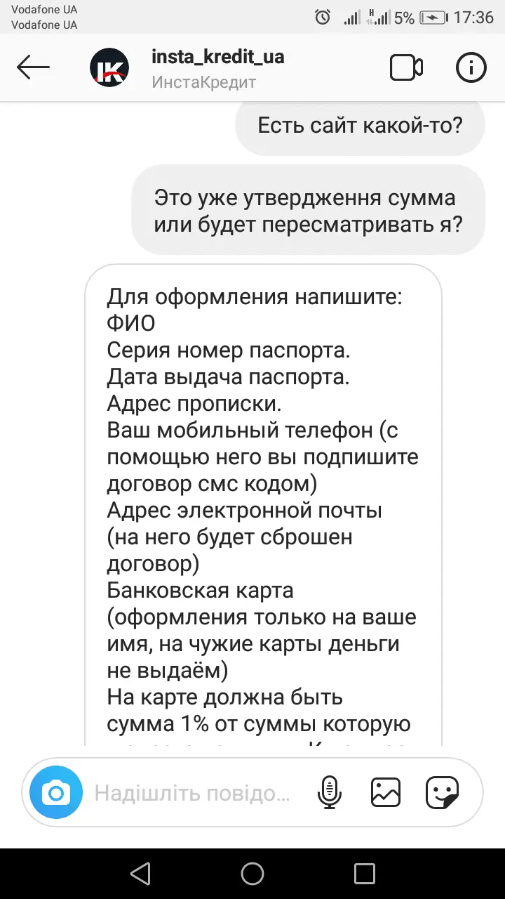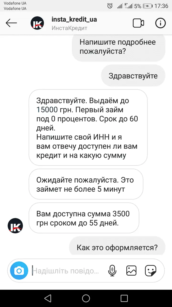 Зачем вы вводите людей в заблуждение?! Прочитала вашу информацию и решила ради интереса попробовать, что это за новинка такая. У меня много МФО, в том числе проданных, просроченных, приват кредитка... Отправила сообщение на страничке Инстаграм с вопросом о кредитовании. В ответ: напишите ваш ИНН, чтобы проверить, какая сумма вам будет доступна. Хорошо, отправила. Дальше пришло сообщение (цитирую полностью):Месяц где-то. Есть ещё похожая контора новая, в Инстаграме выдают займы. Инстакредит называется. Перед выдачей кредита копируют всех подписчиков в инсте. Я поступил умнее, создал левый аккаунт в Инстаграме, добавил туда 20 подписчиков. И эти лoxи мне дали 4000 грн при том что у меня просрочки по 3 месяца в МФО. Это новая шарага, можно их кинуть спокойно. Главное создайте левый аккаунт или свой закройте в настройках. Они выдают даже с просрочками. Введете в поиске Инстаграма - insta_kredit_ua