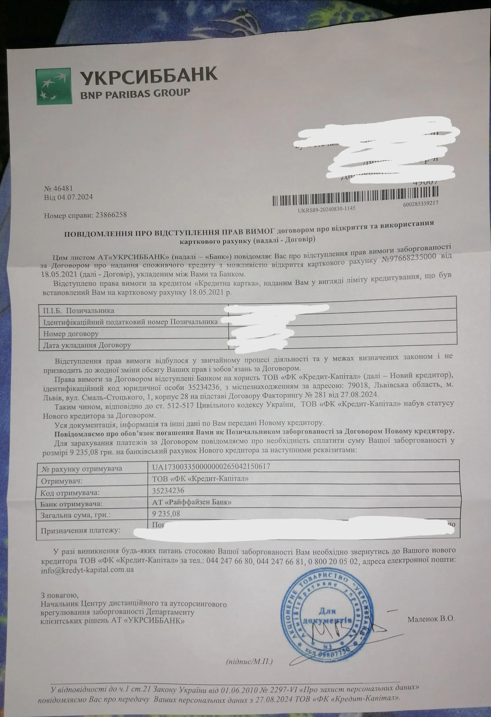 Підскажіть будь-ласка прийшло такий лист на Укрпошту від Укрсиббанк, я зателефонувала Кредит Капіталу на наступний день і сказала, буду сплачувати якщо розіб'єте на платежі, спочатку сказала мені дівчина що ні не можна, я потім надавила, сказала або так, або ніяк.