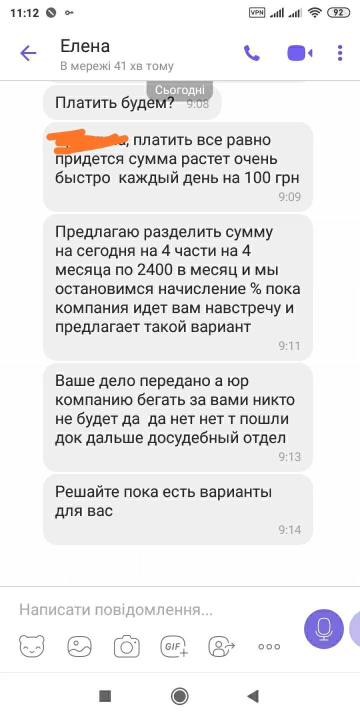 Сегодня к мужу родителям приходило 2 раз домой, культурно предложили разбить сумму на 6 платежей по 3000 грн. Тело 6000, просрочка 4 месяца. Муж позвонил договорились на сумму 6000 одним платежем . Дают неделю