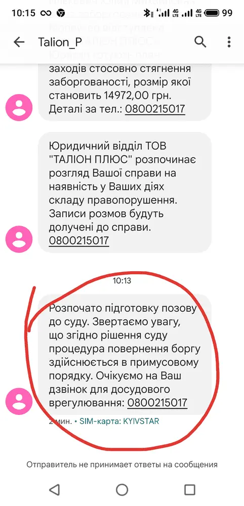 Розпочато підготовку позову до суду. Звертаємо увагу, що згідно рішення суду процедура повернення боргу здійснюється в примусовому порядку. Очікуємо на Ваш дзвінок для досудового врегулювання: 0800215017