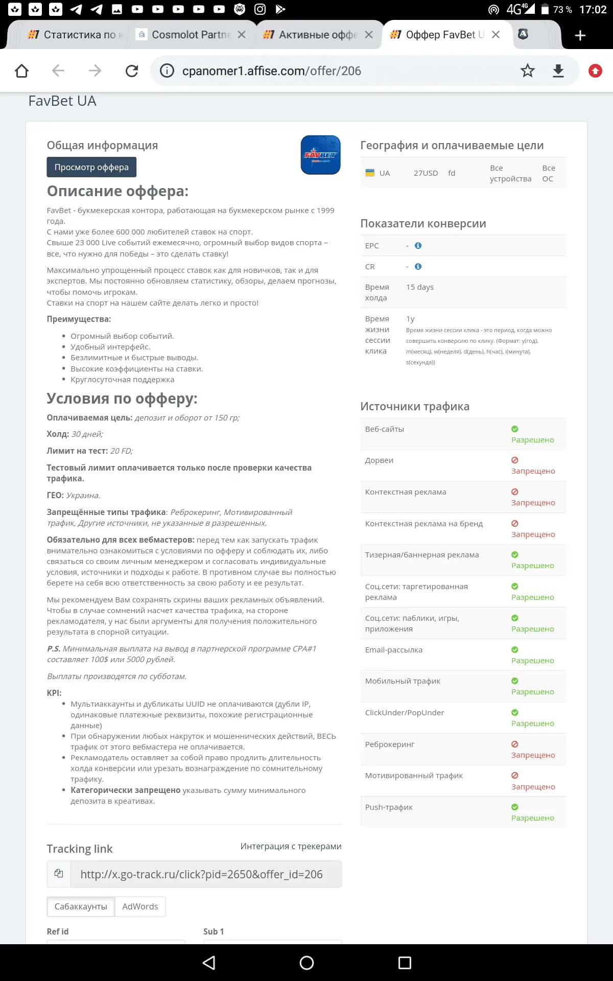 Вот скрины двух офферов из разных партнёрских сетей. Здесь вкратце описаны условия, в принципе премудростей и нет. При регистрации прикрепляют личного менеджера, он обычно оперативно отвечает на все вопросы.