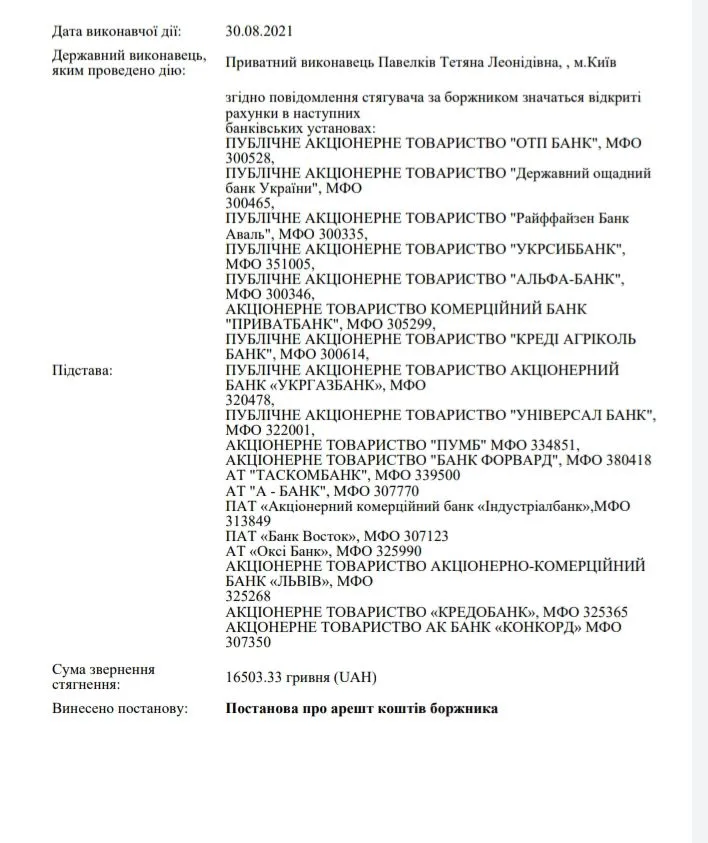 Такс, сумма долга 12730 +500 (виконавчи сбори) + 1273 ее винагорода, а счета арестованы на 16503 .
