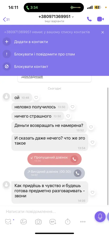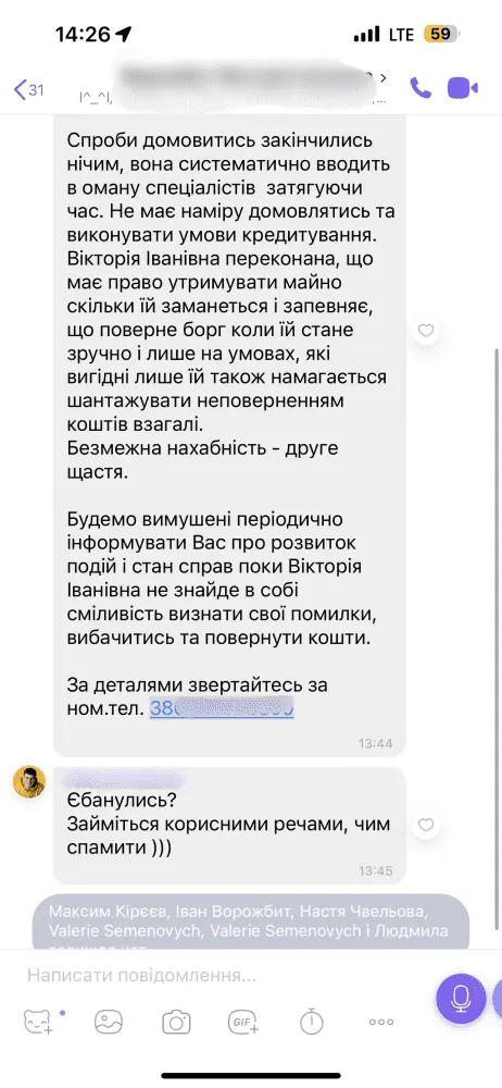 Я позвонила знайомому в кіберполіцію проб’ють номер . Вони звонять з одних тих самих , спочатку звонили по моб потім вацбер , вчора погрожували за наслідки . Писали що я злочинець , і тому подібне , шо я не реалізувалась в житті і не можу віддати кредит . Після цього всього видалили смс , які змогла зробити скріни . Працюють вони до 2 год дня . Самі ж сказали