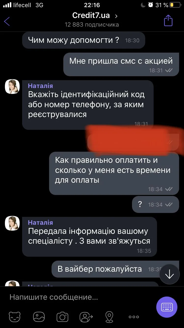 Марина,Увага АКЦІЯ! Кредит7 перед відступленням прав вимоги іншій компанії-дає можливість закрити кредит сплативши лише ТІЛО кредиту в сумі 2 500 грн,і Ваш кредит буде повністю погашено,на сьогодні загальна сумма боргу 7 250 грн. 0443841029,