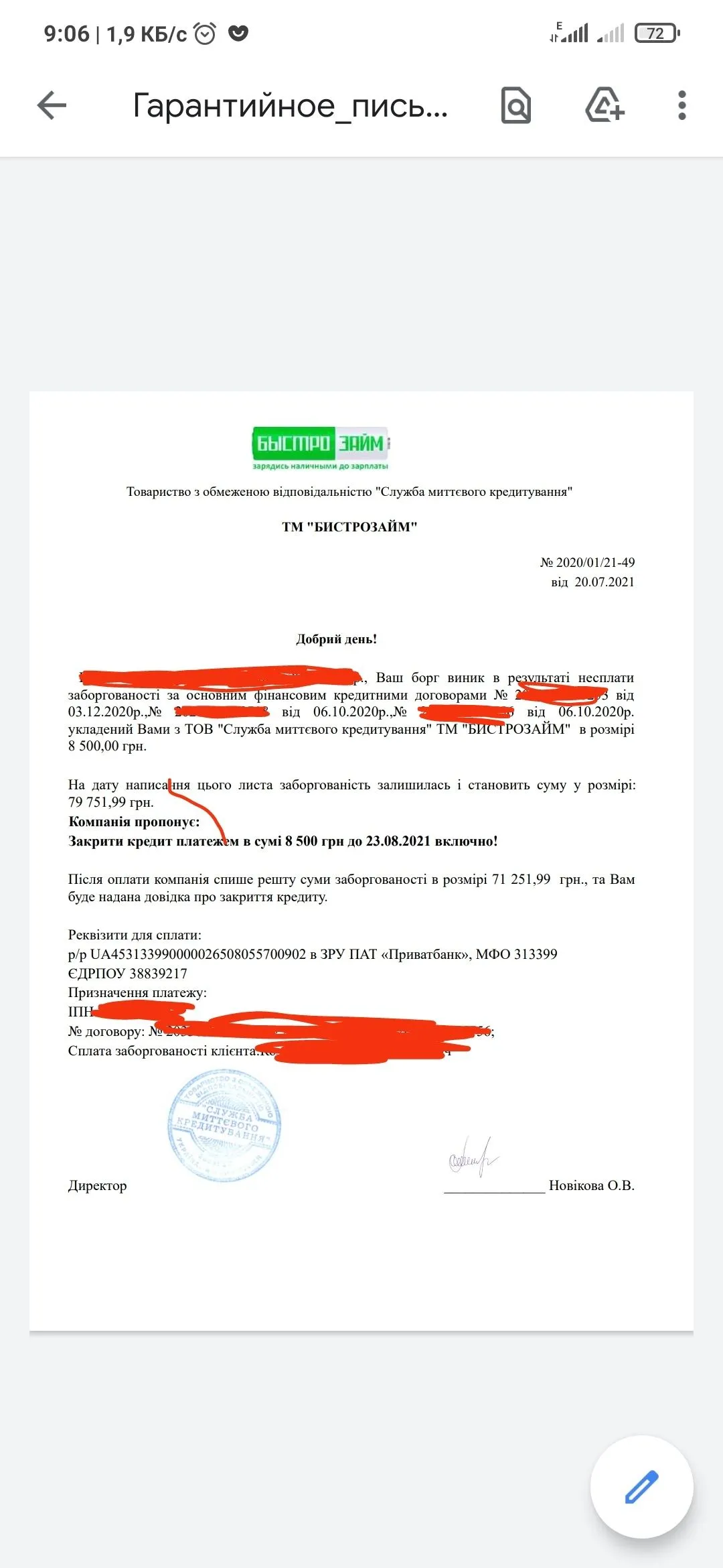 Bystrozajm zakroet Vash dolg 10000 grn v srok oplaty 5 dnej, s momenta polucheniya uvedomleniya. Summa k spisaniyu 426088 grn. 0800507570