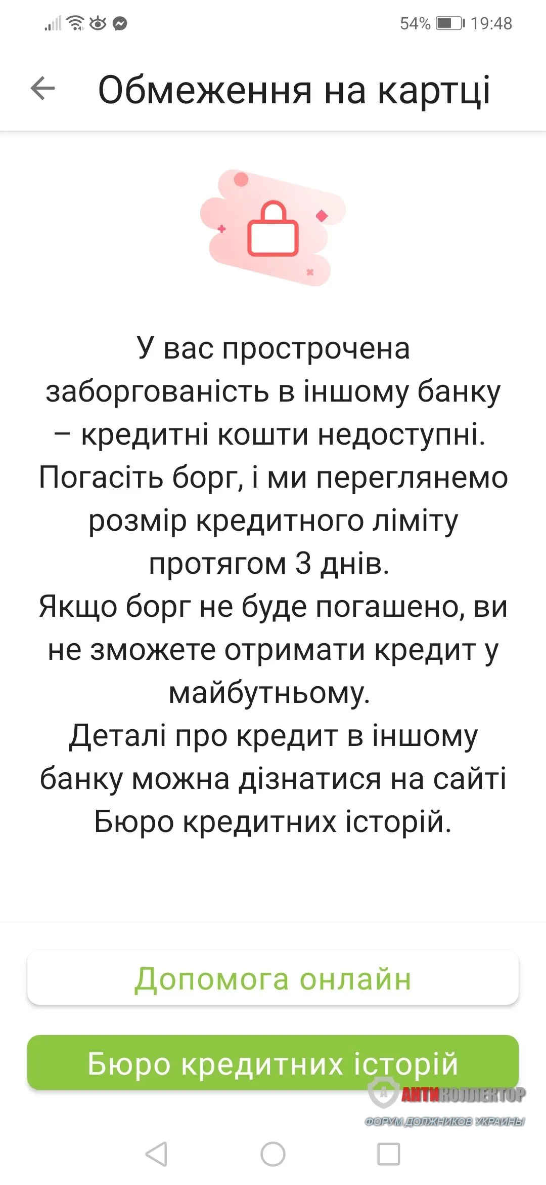 У меня такая же история с кредиткойДивіться, в мене заблоковано кредитку в приваті, але там звичайно все в мінус, просто вона заблокована, пише, що через борг в іншому банку, зарплатна картка все ок.