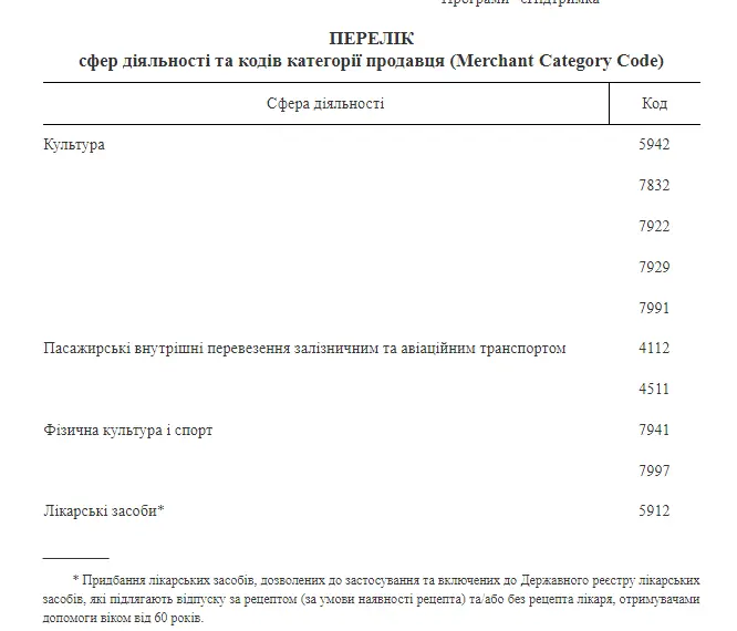 4. Допомога надається отримувачам допомоги виключно для придбання у безготівковій формі з використанням платіжних карток та/або їх реквізитів послуг у сферах культури, фізичної культури і спорту, здійснення внутрішніх пасажирських перевезень залізничним та авіаційним транспортом, для придбання книжок, а також для придбання отримувачами допомоги віком від 60 років лікарських засобів, дозволених до застосування та включених до Державного реєстру лікарських засобів, у суб’єктів господарювання, які провадять господарську діяльність у зазначених сферах на території України, зареєстрованих відповідно до законодавства, та яким банком-еквайром встановлено код категорії продавця (Merchant Category Code, далі - МСС-код) з переліку, наведеного у додатку 1 (далі - суб’єкт господарювання).