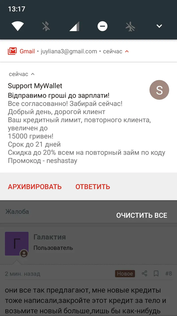 Промокод «не шастай» говорить сам за себеНарод,хотите поржать?Смотрите прикол.Что мне майволлет на электронку прислали(и это при том,что у меня по ним сегодня 1 день просрочки).Как это понимать?