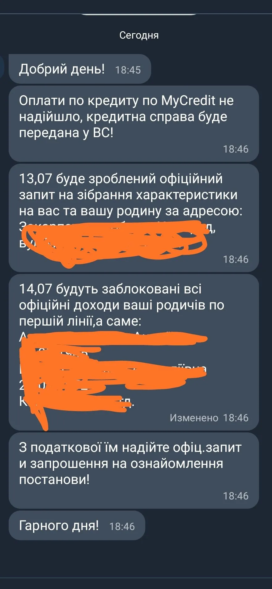 «Всі офіційні доходи ваші родичів» ? удалите и забудьте, пол года такое читаю уже ?Написали май кредит что делают запрос на мою семью, на родителей, жену и блокируют им счета ,и с налоговой будут писать. Стоит волноваться?